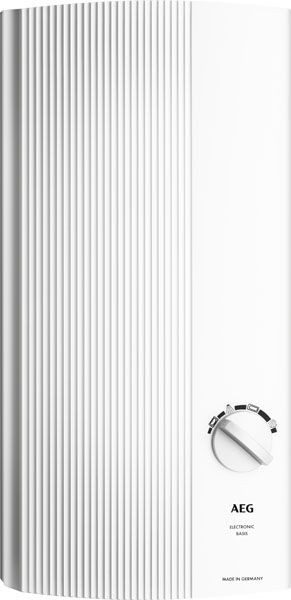 AEG elektronischer Durchlauferhitzer DDLE Basis 18/21/24, 18/21/24 kW, 400 V, Weiss   Durchlauferhitzer, elektronisch geregelt, zur Versorgung von Waschtisch, Küchenspüle, Dusche, Badewanne. Elektronik mit guter Temperaturkonstanz. Temperaturwahl (von ca. 30 C bis 60 C). Heizblock aus glasfaserverstärktem Polyamid. 4 Heizwendeln direkt im Wasser liegend. Messturbine zur präzisen Durchflussmengenerfassung, elektronische Lufterkennung. Anschlussmöglichkeiten für Fern- und Direktzapfung. Für den Anschluss an VPE Kunststoffrohre mit DVGW-Prüfzeichen. Einfache Montage durch separates Montageblech und Drehverschluss, mit Montageschablone, Haubendemontage von vorne, ohne Schrauben, Elektroanschluss von oben oder unten. Stromversorgung mit Festanschluss. Übertischmontage, Untertischmontage mit Sonderzubehör UT 104 möglich. Anschluss an alle handelsüblichen geschlossenen Armaturen. Qualitäts- und Sicherheitszeichen: CE-Zeichen, VDE-/ GS-Zeichen, Funkschutzzeichen / EMV.   Anschlussspannung : 3/PE ~ 400 V 50Hz Anschlussleistung : 18/21/24 kW (umschaltbar) Absicherung : 3 x 35 A (24 kW) Temperaturwahl : ca. 30C - 60 Grad C Schutzart : IP 25 Warmwasserleistung : 9,9/11,6/13,2 l/min (bei Nennleistung und 26 K Temperaturerhöhung) Einschaltmenge : 3,0 l/min Spezif. Widerstand (Wasser) : >900 cm Abmessungen H/B/T : 485/226/93 mm Gewicht mit Wasserfüllung : 4,0 kg