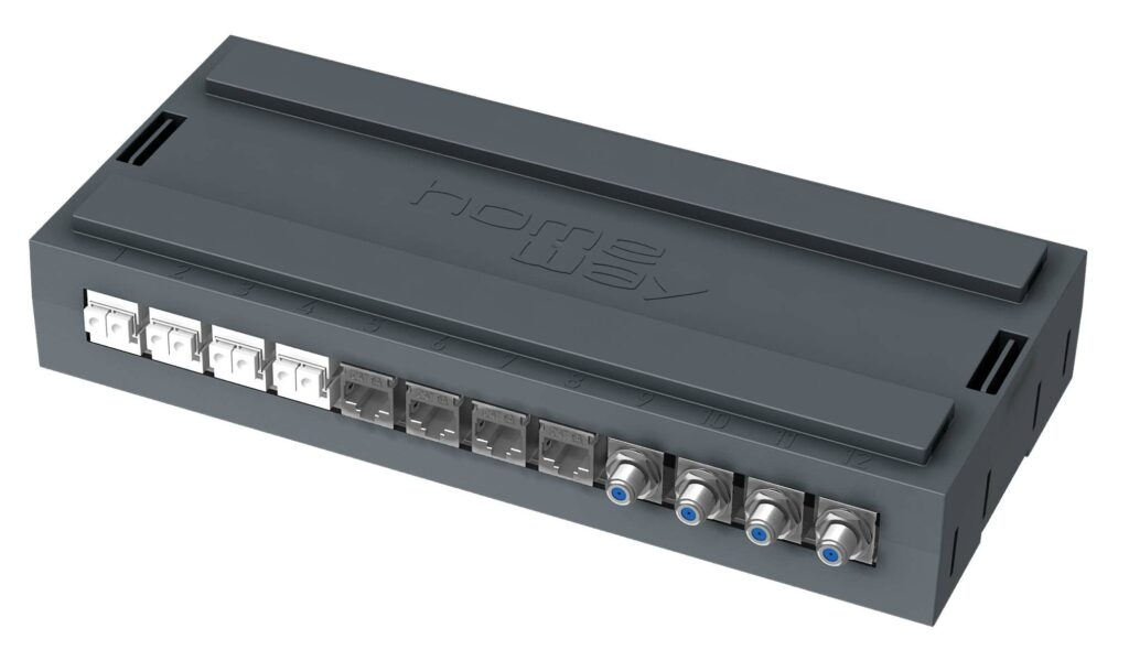 Der homeBox NX12 Verteilerfeldbox von Homeway ist mit 12 Ports zur Aufnahme von Keystone-Modulen (LC Duplex, RJ45, Koax) ausgestattet. Glasfaser-, LAN- und Koaxialanschlüsse können an den 12 Ports beliebig kombiniert werden. Sollten mehr als 12 Multimediaanschlüsse benötigt werden, lassen sich mehrere homeBox NX12 Verteilerfeldbox einfach per Klick übereinanderstapeln oder nebeneinander anordnen. Ihre Variabilität beschleunigt die Installation spürbar. Das 2-teilige Kunststoffgehäuse wird auf einer DIN-Hutschiene oder in einer Multimediazentrale montiert. Nachdem alle Verbindungen hergestellt wurden, wird die gesamte Kabelverteilung von der formschönen Oberschale verdeckt. Besonders Bewohner von Einfamilienhäusern oder Wohnungen schätzen den hochwertigen, von Kabelwirrwarr befreiten Gesamteindruck, den die homeBox NX12 vermittelt. Die normkonforme Einbindung der Koaxialverkabelung in den Potenzialausgleich geschieht automatisch. Ermöglicht wird dies durch den Einsatz neuartiger Koax-Keystone-Adapter aus einem besonderen Federstahl, der korrosionsbeständig ist. Er gewährleistet eine durchgängige, elektrische Leitfähigkeit bis zur Hutschiene. Zusätzliche Potenzialausgleichskabel werden nicht benötigt. Ein Glasfaser-Überlängenspeicher sowie ein Crimpspleißhalter sind ebenfalls integriert. Die homeBox NX12 verfügt über die Maße B x H x T: 246 x 46 x 110 mm. Mit einer Bauhöhe von nur 46 mm ist sie deutlich flacher als übliche Verteilfelder. Als Breite wurde bewusst „Halb-19-Zoll“ – also 9,5 Zoll – gewählt, um einen möglichst vielfältigen Einsatz, sowohl in Kleinverteilern als auch in größeren Objekten, zu ermöglichen. Installationshinweis: Nicht steckerfertige, elektrische Geräte oder Bauteile, müssen von einer qualifizierten Elektrofachkraft installiert werden. Bitte beachten Sie auch die Gebrauchsanweisung. Weitere Informationen erhalten hier § 13 NAV. EAN: 4250679716740 |