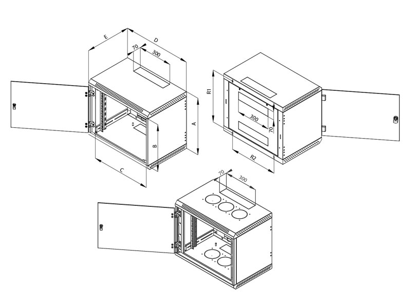 Mit Vollglastür und Schloss, die verwendeten Aufhängungen ermöglichen ein Öffnen um 180 und bei Bedarf eine einfache Demontage. Die Kabeleintrittsöffnungen befinden sich im oberen, hinteren und unteren Teil. Sie sind mit herausbrechbaren Blindplatten versehen. An jeder Seite sind zwei Befestigungsleisten mit 19-Teilung befestigt, deren Position angepaßt werden kann. Die Bürstenleisten in den Kabeleintrittsöffnungen verhindern, daß Staub in den Schrank gelangt. Schrauben für die Anbringung des Gehäuses an der Wand sind beigelegt. Die Perforation seitlich im Boden und Deckenbereich gewährleistet eine natürliche Entlüftung. Der Schrank hat ein Erdungssystem. Die maximale Belastung des Verteilers beträgt bis 30 kg, Schutzart: IP 30