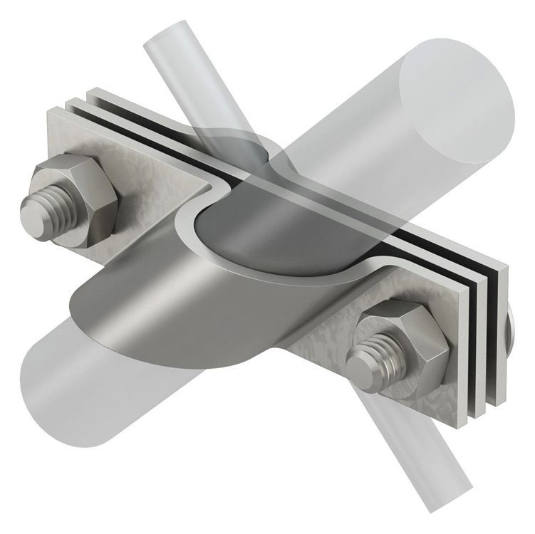Anschlussschelle passend zum Anschluss von Rundleiter Rd 8-10 bzw. Flachleiter bis FL40, mit Zwischenplatte. Montiert mit 2 Sechskantschrauben M10 x 30 und 2 Sechskantmuttern M10.