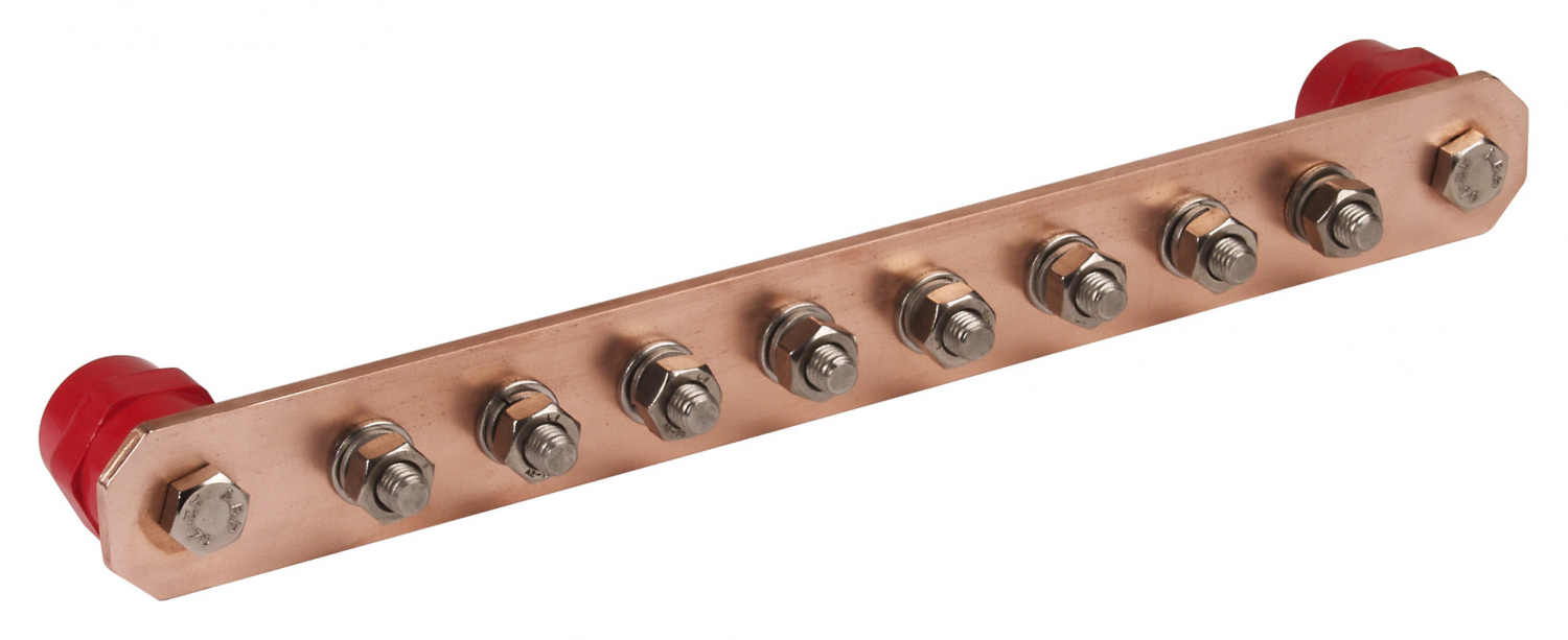 Potentialausgleichsschiene Industrie nach DIN EN 62561-1, für den Schutz und Funktionspotentialausgleich nach DIN VDE 0100-410/540 und den Blitzschutz-Potentialausgleich nach DIN EN 62305-3 (VDE 0185-305-3). Mit Isolator UP (duroplastisch, rot) mit Gewinde M10, UV-stabilisiert und halogenfrei. Auch für den Einsatz in Ex-Bereichen geeignet (Selbstlockern der Schrauben gesichert). Ausführung mit 8 Anschlüssen - Schraube M10, Federring und Mutter.