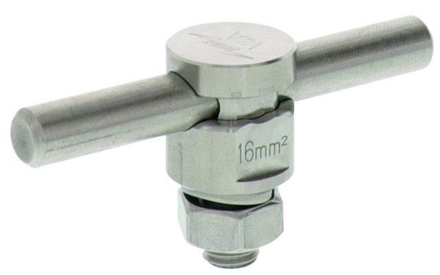 KlemmSchrauben-Verbinder nach DIN EN 62561-1, zum blitzstromtragfähigem Anschluss von Rundleitern z. B. an Flachprofile, Regenrohrschellen oder andere Teile der Blitzschutzanlage. Ausführung einteilig NIRO (V4A) mit Schraube, Mutter M10 und Führung mit Schlüsselfläche.