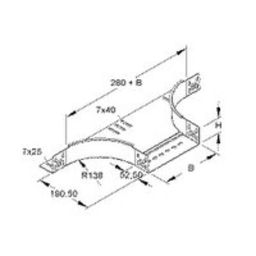 T-Anbaustück, für Kabelrinnen, zur kostengünstigen Herstellung von 90 T-Abgängen und Kreuzungen, breitenabhängig in der Hauptrichtung, bandverzinkt nach DIN EN 10327, mit integriertem Stossstellenverbinder und anteilmässigem Befestigungszu