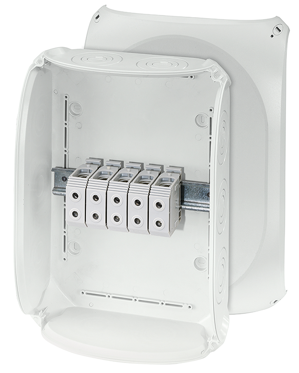 Kabelabzweigkaesten nach IEC 60670-22, mit fest eingebauter Verbindungsklemme und metrischen Vorpressungen.
