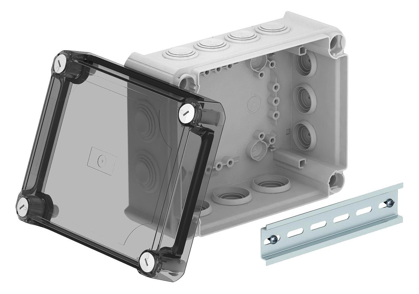 Kabelabzweigkasten zum Verbinden von Kabeln und Leitungen im Innenbereich und geschützten Aussenbereichen. Rechteckige Form mit Einsteckdichtungen an den Seiten und Ausschlageinführungen im Boden. Geeignet für die Wand- Deckenmontage und die Montage auf Montageblechen. Mit der Möglichkeit zur Innenbefestigung und Montage über die Eckdome. Hoher, transparenter Deckel mit Schnellverschluss, plombierbar. Hergestellt aus halogenfreien Materialien. Inklusive Hutprofilschiene. Kabelabzweigkasten gemäss DIN EN 60670. Flammwidrig nach DIN EN 60695-2-11, Prüftemperatur 650C. Schlagfestigkeit IK05 gemäss DIN EN 50102. T 160 HD TR