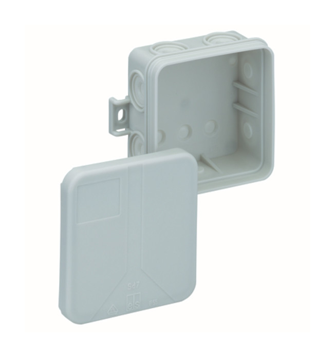 Verbindungsdose nach DIN EN 60670 (VDE 0606), 7 Einführungen, 3 Bodeneinführungen, komplett mit Lochwerkzeug und Verschlussstopfen, mit außenliegenden Befestigungsstellen, mit Schutzart IP55, bis 2,5², mit Schutzgrad IK07, Schutzklasse II, VDE geprüft, Halogenfrei, 75 x 75 x 37, grau, ohne Klemmen, für VDE-zugel. Einzelklemmen