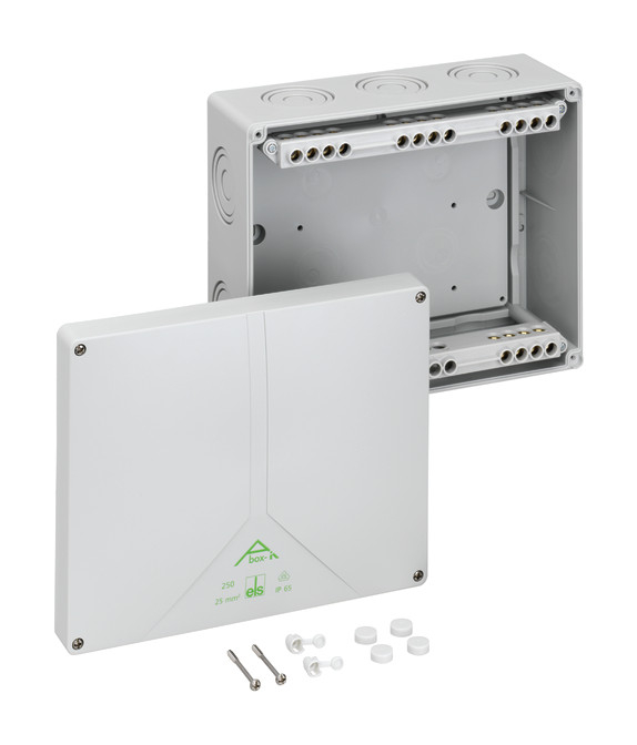 Verbindungsdose - Industrie Qualität - nach DIN EN 60670 (VDE 0606), Ui=690V, witterungsbeständig, schlagfest, halogenfrei, mit Plombierset, passende Kabeleinführungen siehe Zubehör, Schutzart IP65, bis 25², Schlagfestigkeit IK08, Schutzklasse II, VDE geprüft, Halogenfrei, 250 x 200 x 115, grau, mit hochliegenden Schraubklemmen, 5-polig - 25 mm² (4 x 10² / 4 x 16² / 4 x 25²)