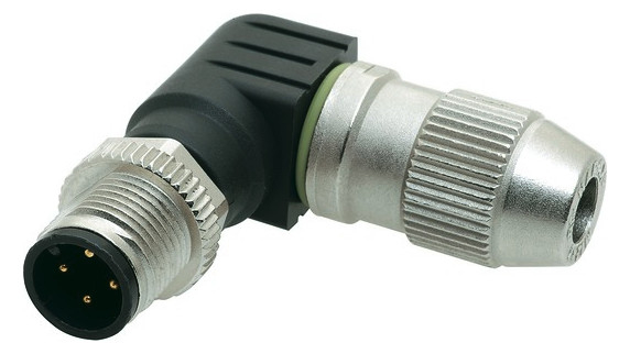 Kabelsteckverbinder, gewinkelt, Stift, A-Kodierung, HARAX Anschlusstechnik, Polyamid (PA), Kontakte: 4, Messing Au über Ni steckseitig, Leiterquerschnitt: 0,25...0,5 mm², Bemessungsstrom: 4 A, Polyamid (PA), Zink-Druckguss, Schraubverriegelung, Schutzart: IP65 / IP67 im gesteckten Zustand