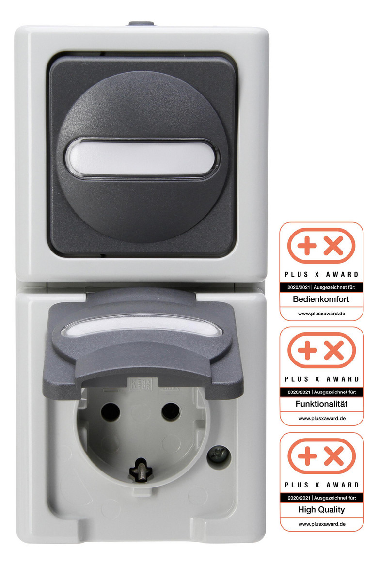 Schalter-Steckdosenkombination BLUE ELECTRIC®, senkrecht, Aufputz-Feuchtraum, IP44, grau EAN: 4008224259415 |