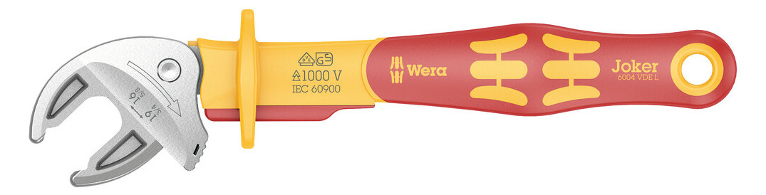 Stückgeprüftes Werkzeug gem. IEC 60900 bei 10.000 V für sicheres Arbeiten bei der zugelassenen Spannung von 1.000 V. Der verstellbare VDE Maulschlüssel greift stufenlos und automatisch alle Sechskantgrößen im angegebenen Abmessungsbereich - metrisch und zöllig. Der integrierte Hebelmechanismus klemmt die Sechskant-Schraube bzw. -Mutter zwischen den Backen sicher ein, was die Gefahr des Abrutschens und der Beschädigungen deutlich verringert. Die Ratschenfunktion sorgt für schnelles und durchgängiges Schrauben ohne Absetzen. Durch die Nutzung der Eckweiten-Prismen ist ein Rückschwenkwinkel von nur 30° realisierbar. Die Ein-Schenkel-Konstruktion in Verbindung mit der Ratschenfunktion und dem Eckweitenprisma ermöglicht das Arbeiten auch in engen Bauräumen. Der verstellbare Joker 6004 VDE verfügt dank der 2-Komponenten-Kunststoffisolierung über einen haptisch angenehmen Griff. Die Sicherheit wird durch den Abrutschschutz am vorderen Griffende erhöht. Zusätzlicher Schutz durch die Schiebefunktion für kontaktloses und sicheres Öffnen der nicht-isolierten Backen.EAN: 4013288221773 |