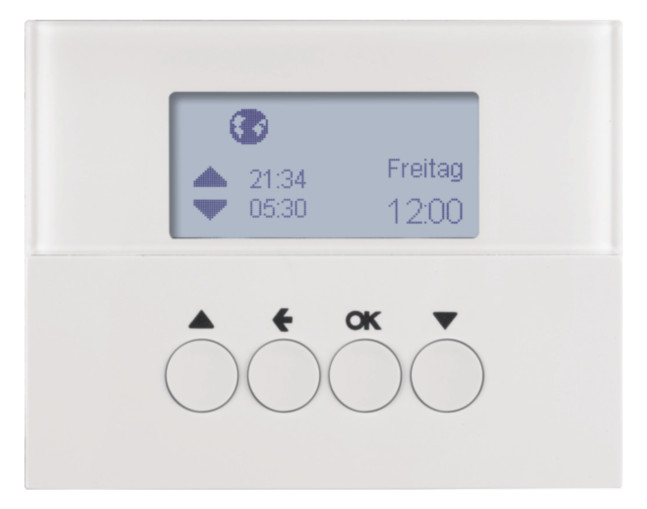 Jalousie-Schaltuhr K.1 polarweiß, glänzend. Jalousie-Schaltuhr mit Display zum Aufstecken auf Jalousie-Einsätze der Elektronikplattform 2012, niedriger Eigenenergiebedarf, 2 unabhängige voreingestellte Programmspeicher individuell anpassbar, mit Umschaltung Hand-/Automatikbetrieb, Astroprogramm für Fahren bei Sonnenaufgang/-untergang mit Stadt/Land oder Koordinateneingabe, individuell anpassbar, Ferien-Programm zur zufälligen Variation der Fahrzeiten im Automatikbetrieb, mit Tastensperre, Party-Funktion, keine Ausführung von Automatik-, Funk- und Nebenstellenbefehlen (Aussperrsicherung), Resetfunktion (auf Werkseinstellung), mit automatischer Sommer-/Winterzeit-Umschaltung (abschaltbar), Anzeige der Aufsatz-/Einsatz-Kompatibilität im Display, LC-Display leuchtet während der Bedienung, LC-Display-Kontrast einstellbar, Menüführung in Deutsch, Englisch oder Französisch einstellbar, mit Demontageschutz. Unterputz-Installation, Flächen-/Designprogramm.