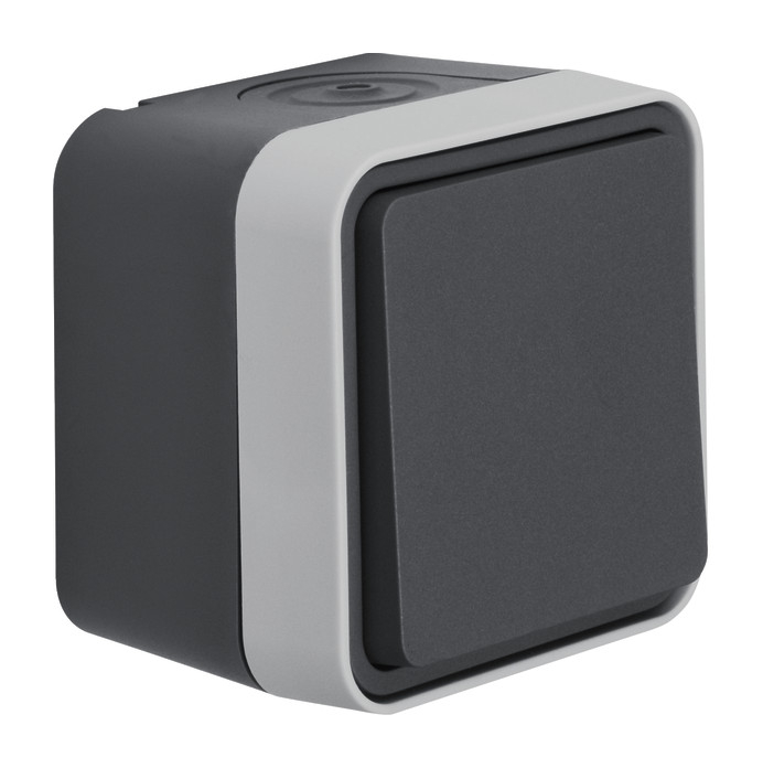 Taster, Schließer AP W.1 grau. Taster Schließer AP, IP55, mit Steckklemmen, mit einer Einführung für 2 Leitungen und einer Einführung für Leitung oder Rohr, vollflächige Dichtung unter dem Gehäuseboden zur Abdichtung der Gehäuserückseite, gut zugängliche, trichterförmige Montagelöcher in den Gehäusen, eine Wago 2-Leiter Verbindungsklemme für Verdrahtung beiliegend, zwei Einrastplätze für Wago 2-Leiter Verbindungsklemmen im Gehäuseboden, viel Platz zur Verdrahtung unter den Sockeln der Einsätze (Hohlboden), einfache Montage des Einsatzes im Gehäuse durch Einrasten, sichere Fixierung des Rahmens am Gehäuse über Bajonett-Schnellverschluss, Gehäuseschrauben aus Edelstahl Rostfrei. Aufputz-Installation. Material: Kunststoff, Thermoplast, schlagfest.