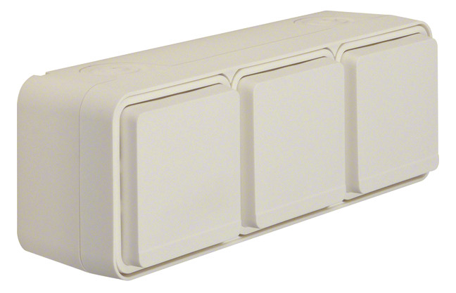 Steckd. SCHUKO 3f. waager. m. Klappd. AP, Schraubkl., W.1, pw. matt. Steckdose SCHUKO® 3-fach waagerecht mit Klappdeckel AP, IP55. Für waagerechte Montage, Einsätze durchverdrahtet, mit Steckklemmen, mit einer Einführung für 2 Leitungen und einer Einführung für Leitung oder Rohr, vollflächige Dichtung unter dem Gehäuseboden zur Abdichtung der Gehäuserückseite, mit zufallendem Klappdeckel, manuell einrastbar, um den Schutzgrad IP55 zu erreichen, gut zugängliche, trichterförmige Montagelöcher in den Gehäusen, eine Wago 2-Leiter Verbindungsklemme für Verdrahtung beiliegend, zwei Einrastplätze für Wago 2-Leiter Verbindungsklemmen im Gehäuseboden, viel Platz zur Verdrahtung unter den Sockeln der Einsätze (Hohlboden), einfache Montage des Einsatzes im Gehäuse durch Einrasten, sichere Fixierung des Rahmens am Gehäuse über Bajonett-Schnellverschluss, Verbindungsklemmen nach VDE 0620-1, Bauart DIN 49440. Gehäuseschrauben und Klappdeckelfedern aus Edelstahl Rostfrei. Aufputz-Installation. Material: Kunststoff, Thermoplast, schlagfest.