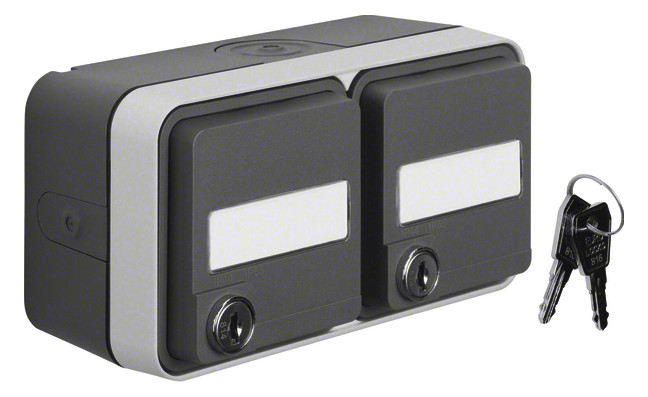 Doppelsteckdose SCHUKO mit Klappd.,Beschr.-Feld,ungl.Schließung AP W.1 grau. Steckdose SCHUKO® 2-fach waagerecht mit Klappdeckel AP - Beschriftungsfeld - Schloss - erhöhter Berührungsschutz, IP55, mit Schloss - ungleiche Schließungen. Für z.B. Waschmaschine und Trockner, mit 4 gleichen Schlüsseln. Für waagerechte Montage, mit 2 Leitungseinführungen, 2 zusätzliche seitliche Leitungseinführungen, mit Hohlboden, mit Steckklemmen. Die obere und untere Einführung für Leitungen sind seitlich angeordnet und daher besonders geeignet für die Montage neben Türrahmen o. ä. Durch die seitlichen Leitungseinführungen besonders geeignet für die Montage über Werkbänke. Beschriftungsfeld ca. 50 x 16 mm, Beschriftungsfeldhöhe für P-touch Band 12 mm ausgelegt, Ersatzschlüssel und andere Schließungen (max. 24) auf Anfrage. Erhöhter Berührungsschutz (Kinderschutz) konform VDE 0620-1, Verbindungsklemmen nach VDE 0620-1, Bauart DIN 49440. Gehäuseschrauben und Klappdeckelfedern aus Edelstahl Rostfrei. Aufputz-Installation. Material: Kunststoff, Thermoplast, schlagfest.