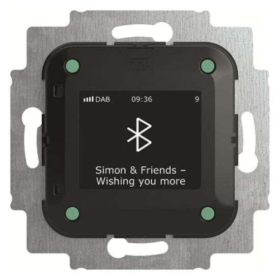 DAB+ und RDS-Stereo-Radiowecker zur Unterputzmontage. Mit hochauflösendem Farbdisplay zur Anzeige von Zusatzinformationen. Mit Bluetooth Schnittstelle zur Musikwiedergabe von mobilen Geräten. Anschluss externer Bluetooth Lautsprecher möglich. Empfangsfrequenz: 87,50 MHz - 108,00 MHz. Empfangsfrequenz (DAB+): 174 MHz – 240 MHz. Mit externem AUX Ein-/Ausang, umschaltbar. Für Mono-/Stereobetrieb. 8 Radioprogramme speicherbar. Mit Uhrzeit und Datumsanzeige. Mit individueller Weck- und Snooze Funktion. Mit automatischer Ausschaltfunktion (Sleep-Automatik). Mit Nebenstelleneingang zum ferngesteuerten EIN-/AUS-Schalten. Mit integrierter Antenne. Mit zusätzlichem Anschluss für externe Antenne. Zulässige Lautsprecherimpedanz: 4 - 8 Ohm Montage in 1-fach- als auch Mehrfachkombinationen möglich. Bluetooth Spezifikation: 4.2. Unterstützte Bluetooth Profile: A2DP Anzahl von gespeicherten Bluetooth-Verbindungen: max. 8 Keine Spreize. Schraubbefestigung über Schlüssellöcher.