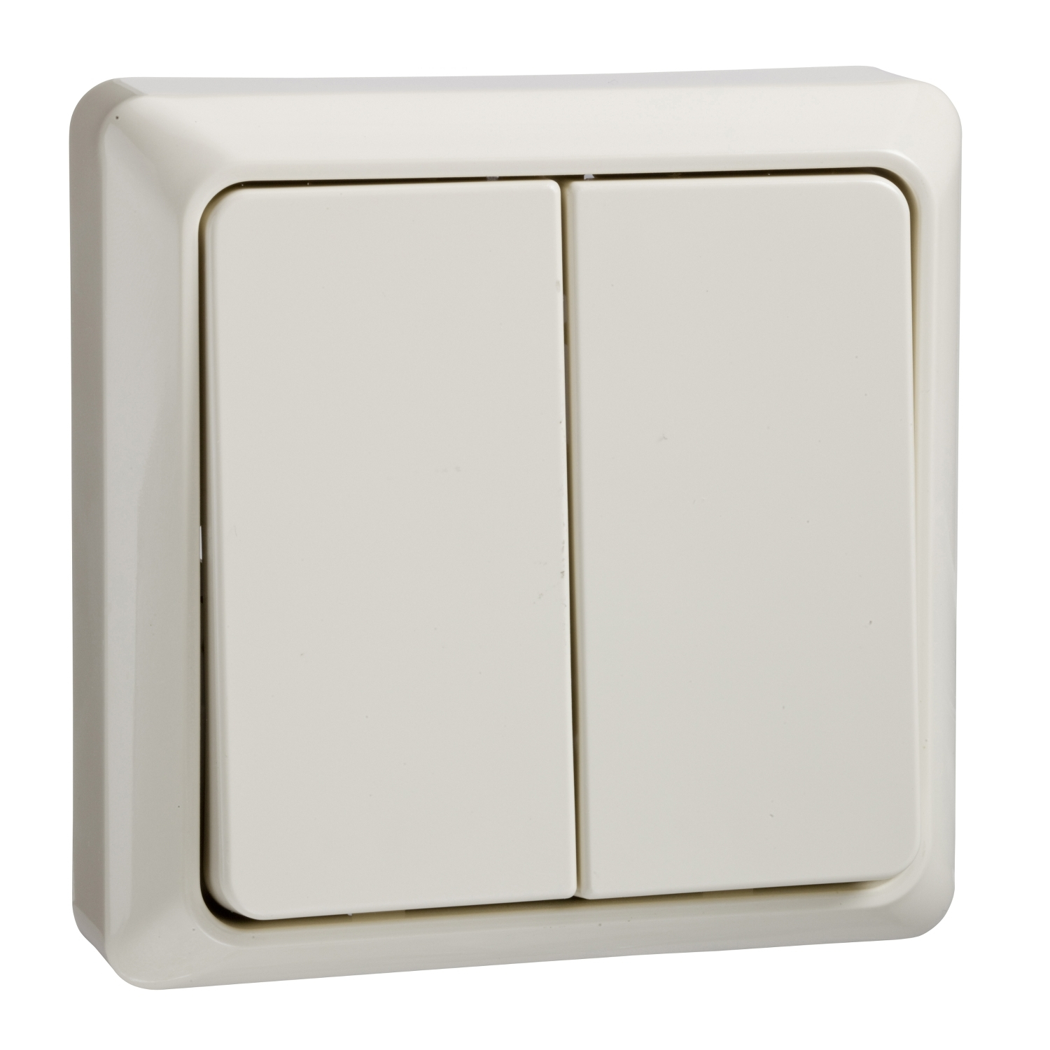 Taster 42 V Nennstrom 1 A Komplettgeräte mit Rahmen und Wippe. Doppeltaster zum Schalten/Dimmen von zwei Fernschaltdimmern. zwei Fernschaltrelais oder Kombination Fernschaltdimmer/Fernschaltrelais Serienfernschaltrelais über zweiadrige Steuerleitung Aufputz. Farbe: perlweiß schraubenloser Klemmanschluss für ein- und vieldrähtige Leiter bis Durchmesser 0,8 mm.