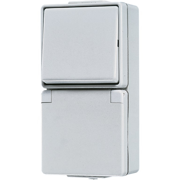 Steckdose, 16 A 250 V ~, mit Wippschalter, 10 AX 250 V ~, Universal Aus-Wechsel, Steckdose mit Klappdeckel, Schalter beleuchtbar im Sinne der Arbeitsstättenverordnung durch Lampe Art.-Nrn.: 90 bzw. 95 (230 V), 96-.. (Kleinspannung) bzw. LED-Leuchte Art.-Nr.: 90-LED.. (230 V) bzw. 961248 LED.. (Kleinspannung)., mit Federklemmen für Leiter bis 2,5 mm², Gehäuseabmessungen (B x H x T): 70 x 140 x 47 mm, 2 Leitungseinführungen