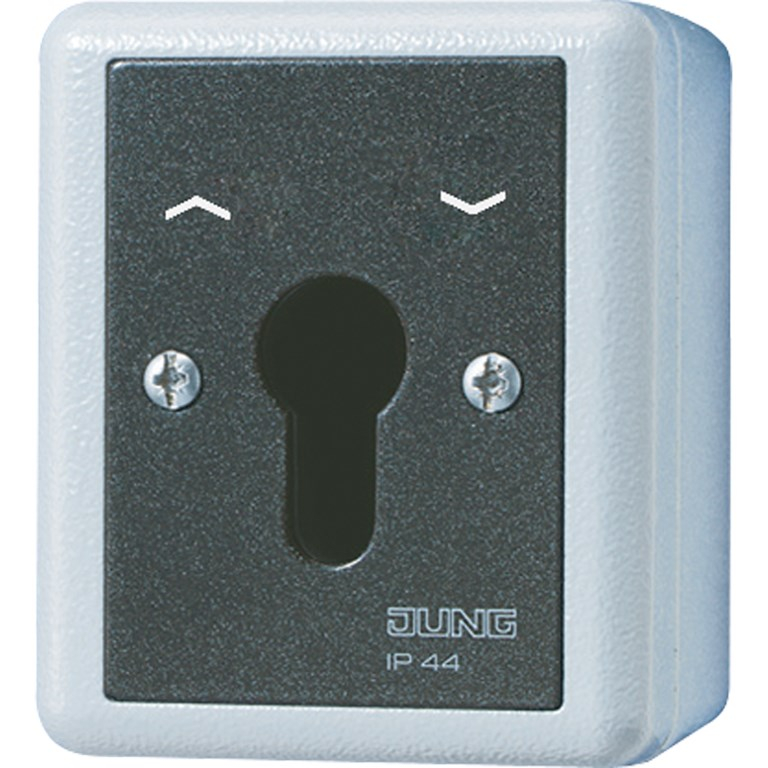 Schlüsselschalter, 10 AX, 250 V ~, mit Alu-Druckguss-Gehäuse, Jalousie-Wendetaster 2-polig, für Profil-Halbzylinder mit ca. 40 mm Gesamtlänge (DIN 18252)