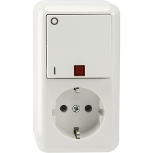 Steckdose 16 A, AC 250 V. Kombiniert mit Wechsel-Kontrollschalter 10 AX, AC 250 V. Aufputz-Montage. Lieferumfang Mit Glimmlampe.