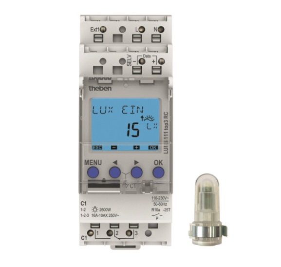 Digitaler Dämmerungsschalter/Lichtsteuergerät, 1 Kanal, Separater Aufbau-Lichtsensor (IP 55) im Lieferumfang, 1-99.000 lx, externer Eingang, Breite 2 TE, App-Programmierung möglich, Sichere Übertragung per optionalem Bluetooth Low Energy OBELISK top3, Maximale Manipulationssicherheit, Programme können nur dann von der App in die Uhr übertragen werden, wenn der Bluetooth OBELISK top3 in der Uhr steckt, 600 Watt LED-Leistung, 800 Ampere/200 Mikrosekunden Einschaltstrom, geringe Stand-by Leistung, Betriebsstundenzähler, DuoFix Steckklemmen, Gangreserve, OBELISK-Schnittstelle für PC-Programmierung
