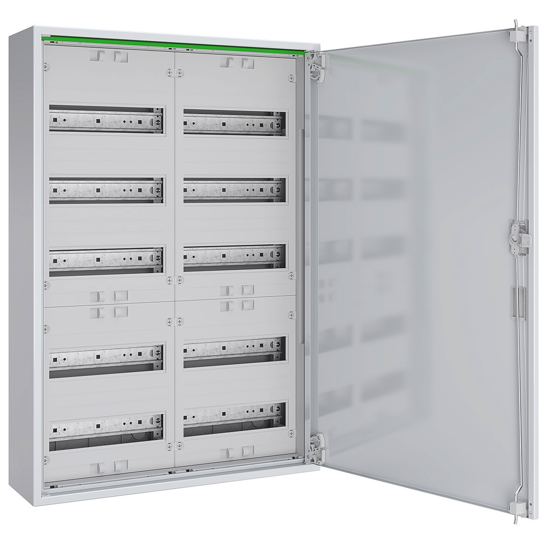 Komplettschrank für Aufputzmontage bestehend aus: RM-Gehäuse mit Volltür, 2x Verteilerfeld 5-reihig, 120 TE, für Reiheneinbaugeräte, mit PE/N-Steckklemmen, IP44