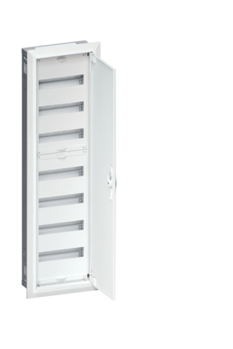 Feldverteiler UP 84PLE mit univers,IP30,SKII, Nischenmaße HxBxT:1107x315x112mm. Feldverteiler UP/HW zertifiziert nach DIN EN 61 439-1/-3, Maßnorm nach DIN 43 870. Zum Einbau von Geräten bis 125 A, Luft- und Kriechstrecken nach VDE 0110/1-2, Schutzart IP30. Bestehend aus Schrank, Blendrahmen und Stahlblechtür, pulverbeschichtet in RAL 9010 (reinweiß). Komplettverteiler mit Einbausatz bestückt mit profilierten Tragschienen, 7,5 mm hohen Hutschienen in 125 mm Mittenabstand und passenden Berührungsschutzabdeckungen (SKII) aus Kunststoff, inklusiv 1xPE- und 2xN-QuickConnect-Klemmblöcke auf Träger montiert. Leitungseinführungen oben/unten durch herausnehmbare Kunststoffflanschplatten mit Vorprägungen und integrierte Kabelzugentlastung. Seitlich und hinten ausschlagbare Leistungseinführungen. Tür mit innenliegenden justierbaren Scharnieren und einem Öffnungswinkel von 110. Türen rechts und links anschlagbar, werkzeuglos wechselbarer Türanschlag. Türverschluss serienmäßig mit Vorreiber und Klappgriff plombierbar. Ab Schrankbreite 800 mm (3-feldig) zwei türiger Aufbau. Rechte Türen maximal 2 Felder breit. Bei Doppeltür mit Stangenverschluss. Blendrahmen Tiefe bzw. Überstand 13 mm. Hinweise: Austauschbare Schließsysteme möglich.