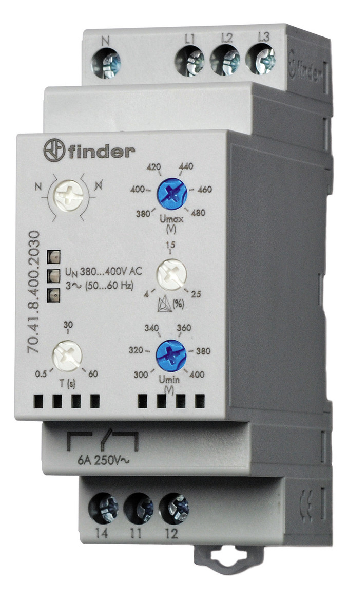 1St. Finder 704184002030 Netzüberwachung, 3-Phasen 380 - 415 V AC, 1 Wechsler 6 A, Phasenausfall, Phasenfolge, Asymmetri