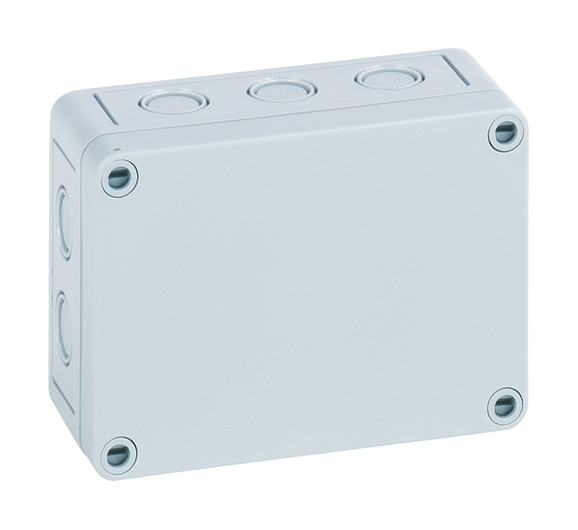 Leergehäuse, Kasten und Deckel: Polystyrol, grau, ähnlich RAL 7035, Schutzart IP66, mit Schutzgrad IK07, Schutzklasse II, Bemessungsisolationsspannung Ui 690VAC/DC, Ui=1000VDC, Halogenfrei, 130 x 94 x 57, mit metrischen Vorprägungen