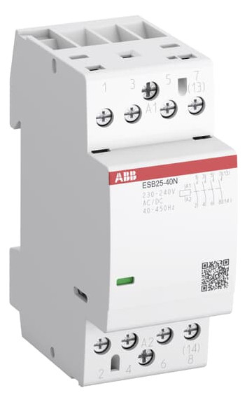 4-polige Schütze ESB25..N mit 36 mm Baubreite steuern 3-phasige Lasten bis 25 A und stehen in unterschiedlichen Kontaktbelegungen und Spulenspannungen zur Verfügung. Sie schalten elektrische Heizgeräte, Warmwasserbereiter, Motoren für Pumpen, Lüftung und sonstige Antriebe ebenso wie Beleuchtungen. Durch eine integrierte Spulenbeschaltung arbeiten sie sowohl mit AC- als auch mit DC-Steuerspannungen. Die Geräte sind deshalb absolut brummfrei und leise beim Schalten. Ein als Zubehör linksseitig anbaubarer Hilfsschalter sowie Plombierkappen und ein Distanzstück ergänzen das Sortiment. ESB25..N haben Installationsdesign und erfüllen u.a. die Haushaltsnorm EN61095, sie sind daher besonders geeignet für den Verteilereinbau.