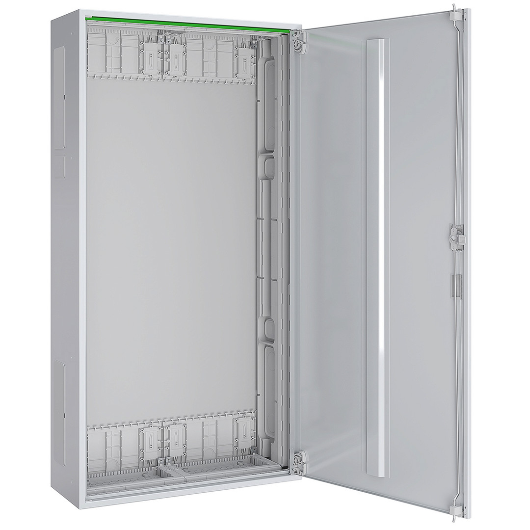 Systemgehäuse für AP-, UP- und teilversenkter Montage, bestehend aus: Leergehäuse mit flächenbündiger Leitungsmembran, seitlichen Vorprägungen für Querverdrahtung im AAR und Sammelschienenverbindung im NAR, Volltür, Abmessungen: 550x1100x210 mm, Schutzklasse II (schutzisoliert), Schutzart IP44, Stahlblech pulverbeschichtet, 168 Teilungseinheiten