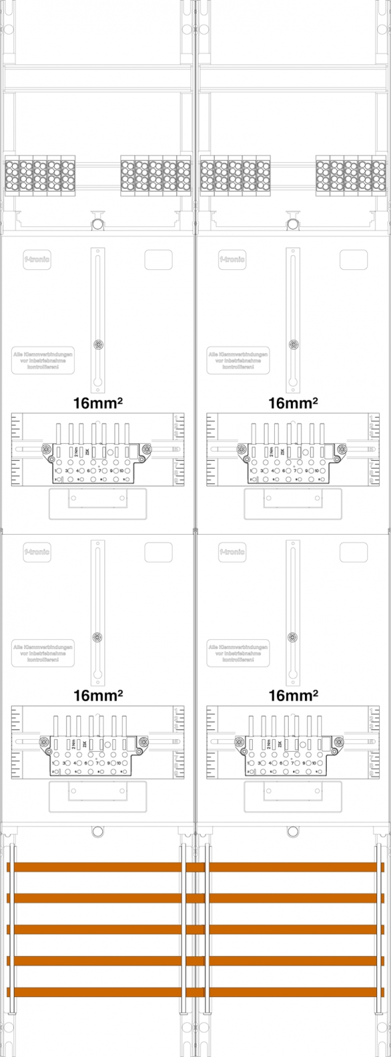 Zählerfeld 2-feldrig, 4-Zählerplätze 3.HZ 16mm² Verdrahtung, Höhe 1350 mm, Breite 250 mm,Sammelschienensystem 5-polig, mit Zählersteckklemme und Stiften
