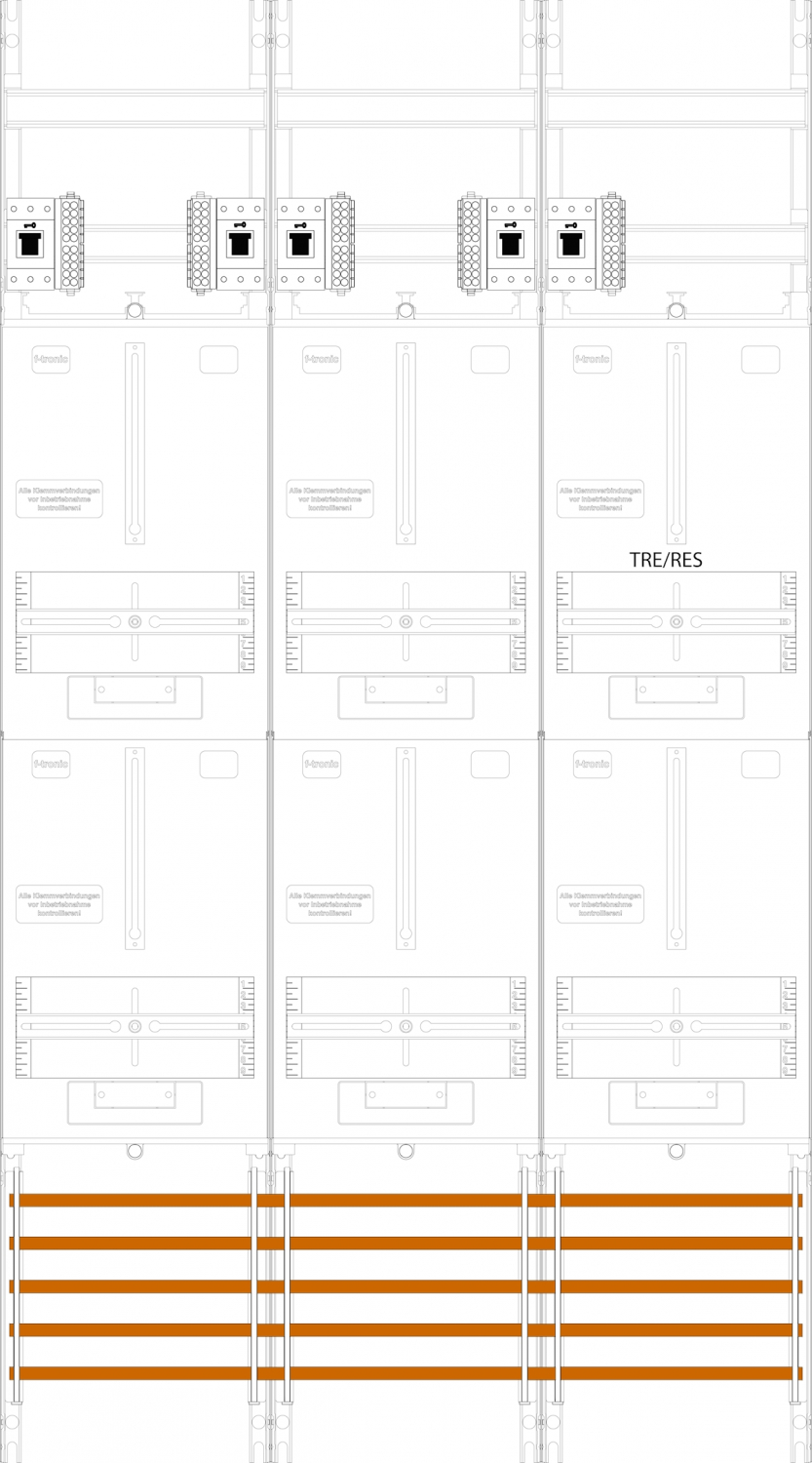 Zählerfeld 3-feldrig, 5-Zählerplätze 3.HZ, Höhe 1350 mm, Breite 750 mm, 1-Reserveplatz ,Sammelschienensystem 5-polig, mit Hauptschalter sperrbar
