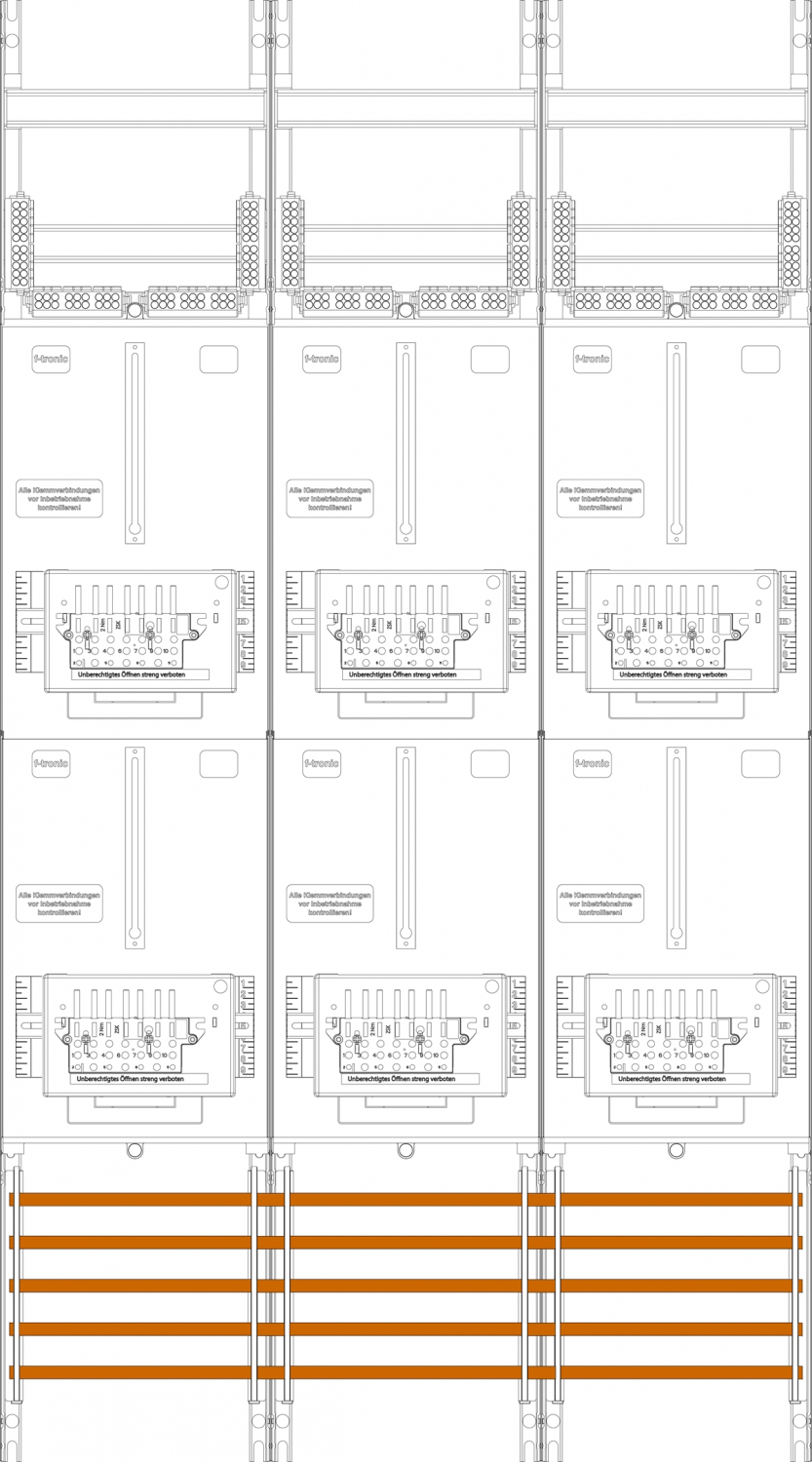 Zählerfeld 3-feldrig, 6-Zählerplätze 3.HZ, Höhe 1350 mm, Breite 750 mm, Sammelschienensystem 5-polig, mit Zählersteckklemmen-Set