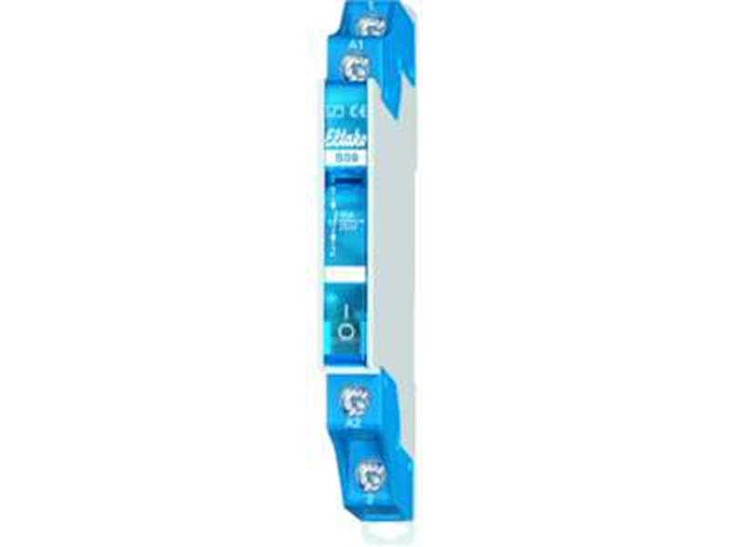 Stromstoßschalter mit Handbetätigung und Schaltstellungsanzeige. Nur 1/2 Teilungseinheit. Steuerleistungsbedarf 5W. Für Impulssteuerung. Kontaktabstand 3mm.