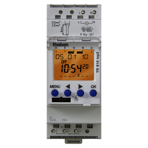 1St. Theben 6100110 Reiheneinbau-Digital-Zeitschaltuhr 1 Kanal, 7 Tage, Textzeile, Steckkl., 2 TE TR 610 top2 G